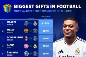 体育资讯12月26日讯 德国转会市场统计了足坛历史免签球员的身价,并列出榜单,姆巴佩1.8亿欧居首,梅西8000万欧次席。