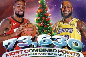 本场比赛,湖人前锋勒布朗·詹姆斯与火箭前锋凯文·杜兰特将同场竞技。据NBA官方统计,此役将创造NBA历史得分最高的对决!